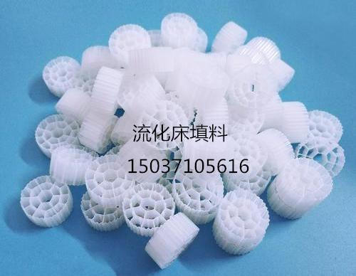 流化床生物填料外觀:周邊帶齒,中心到外圓有三層圓,失圓率≤20%,齒深≮1mm 、原料采用乙丙共聚主材料,長時間浸泡在廢水不會降解,也不會對微生物有毒害作用,優于采用其它諸如聚氯乙烯等材料。