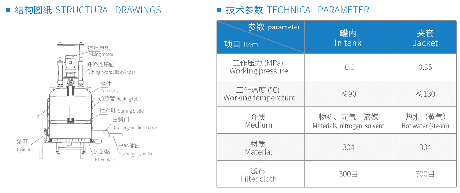 在同一容器內(nèi)完成過(guò)濾、洗滌、干燥全過(guò)程連續(xù)操作。 1.過(guò)濾:在真空狀態(tài)下操作,實(shí)現(xiàn)固液分離。過(guò)濾時(shí)濾餅平整,固液分離效果好。 2.洗滌:在容器內(nèi)側(cè)有360°旋轉(zhuǎn)噴淋裝置,使得清洗(洗滌)液均勻分布于容器內(nèi),可實(shí)現(xiàn)容器內(nèi)部清洗和物料槳化洗滌,通過(guò)升降槳葉攪拌將濾餅和洗滌液混合,使?jié){狀晶體及濾餅得到充分洗滌。 3.干燥:濾餅被攪拌槳葉逐層刮松,設(shè)備加熱裝置均勻?qū)V餅加熱,在真空狀態(tài)下用熱氣體對(duì)濕物料加熱,加速蒸發(fā),實(shí)現(xiàn)干燥目的。 4.卸料:刮松物料,通過(guò)攪拌葉推動(dòng)從罐壁側(cè)面出料口自動(dòng)卸料。